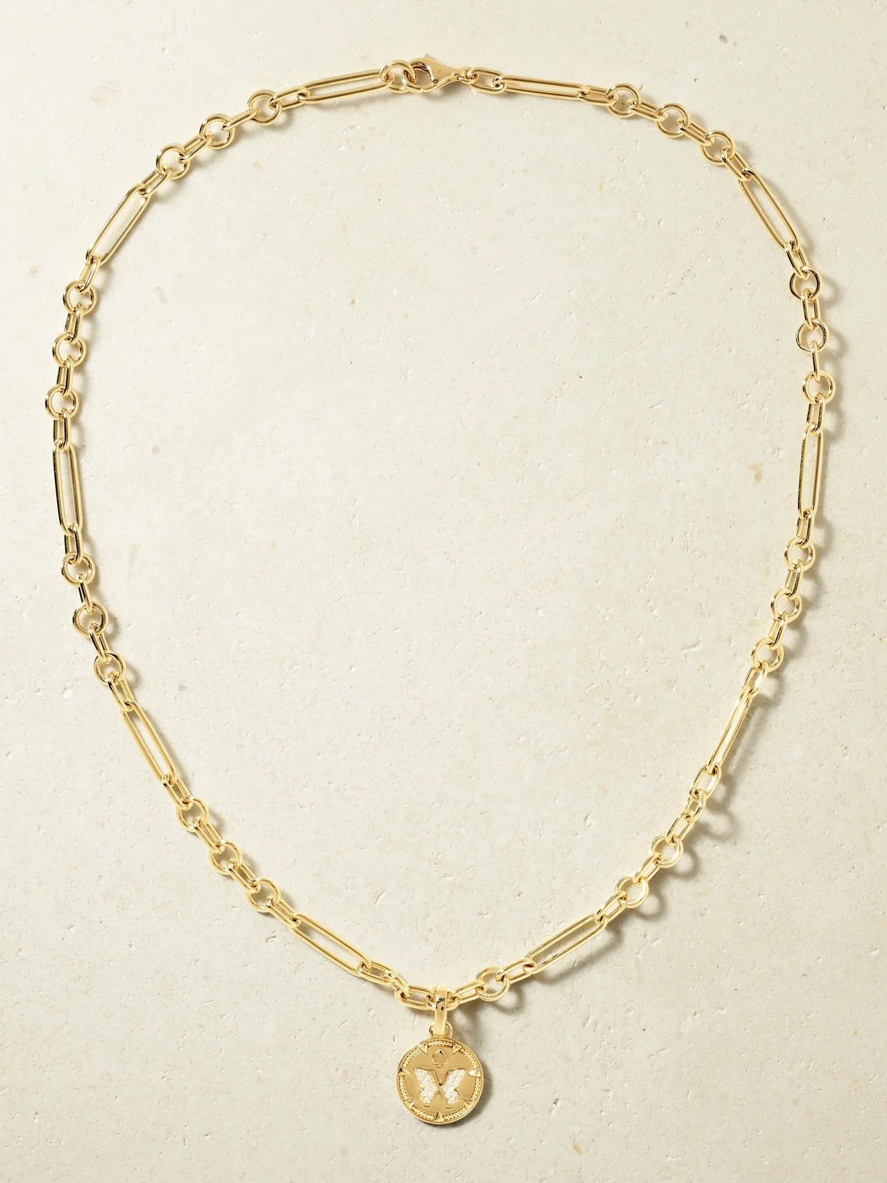 Foundrae's necklace is strung with a diamond-encrusted butterfly medallion meant to symbolize reverie and joy. The 'Small Mixed Clip' chain is handmade from 18-karat gold.