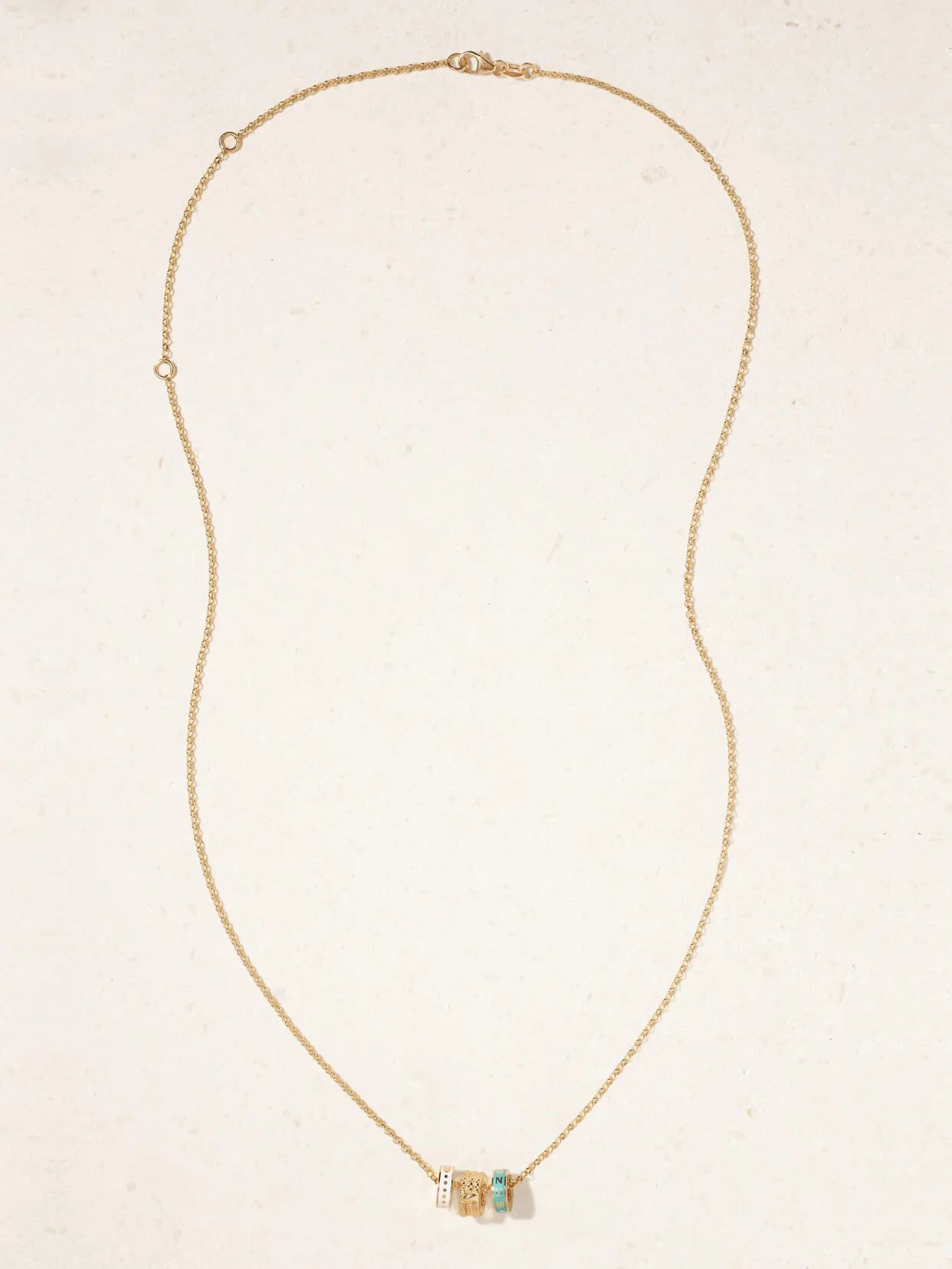 Foundrae's necklace is strung with three painted rings that the jeweler calls 'heart beats' - each one symbolizes key tenets of reverie, the snake and wholeness - the first represents joy and the second a sense of completeness. It's handcrafted from 18-karat gold with a fine belcher chain.
