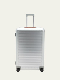 Ideal for ten to eleven day journeys Hardsided luggage crafted of aluminum, leather, and polyester Approx. 19"W x 11"D x 20"T Top handle Butterfly closures Side handle Integrated TSA lock Four dual wheels Interior removable padded lining Interior straps Item Weight: 15.0 lbs Lining: Polyester Trim: Leather Made in Italy