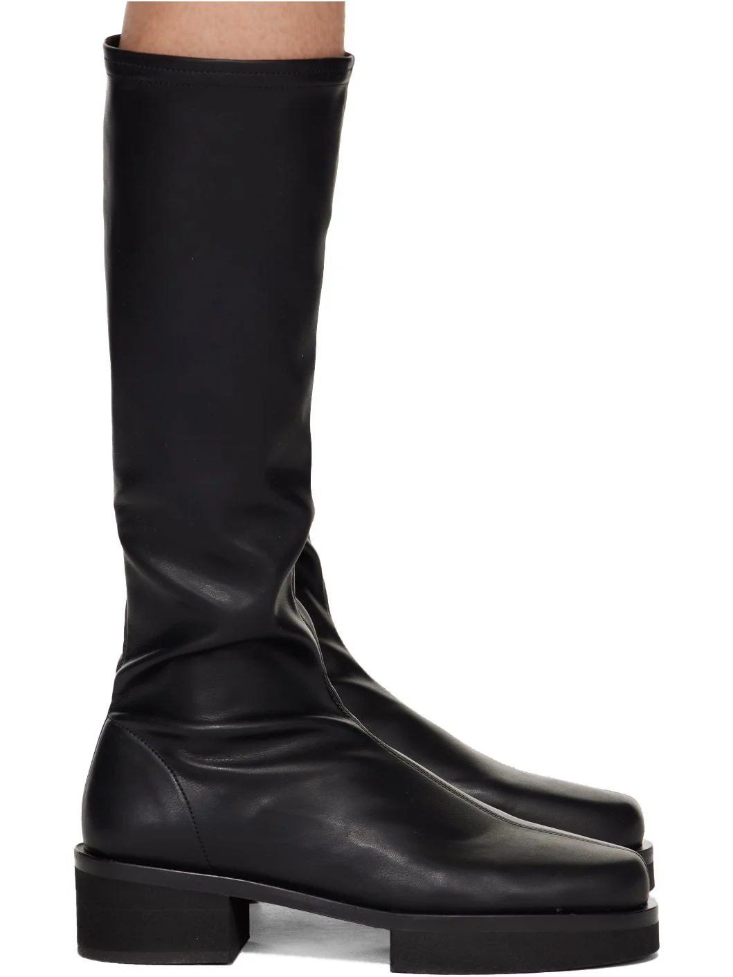 Knee-high paneled buffed faux-leather boots in black. · Rubber block heel and midsole · Rubber outsole · Heel: H1.5 in Supplier color: Noir Upper: synthetic. Sole: rubber. Made in Portugal 231455F115001