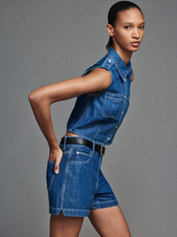 Our sweetest short yet. The Charm Short sits high at the waist with a mini inseam, wide hem, and side slits for a touch of polish. Rendered in Graphic—a rigid denim with a unique red-blue hue that pairs with The Major Shirt for a chic summer suit. Materials & Care High Rise Fit Machine Wash Cold 80% Cotton/20% Pre Consumer Recycled Cotton 12" Front Rise/3" Inseam/25.25" Leg Opening 4009475-GRPH Fit Model is 5'6"/168cm and is wearing a US Size 26 Sample size:11" Front Rise, 33" Inseam, 19" Leg Opening