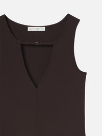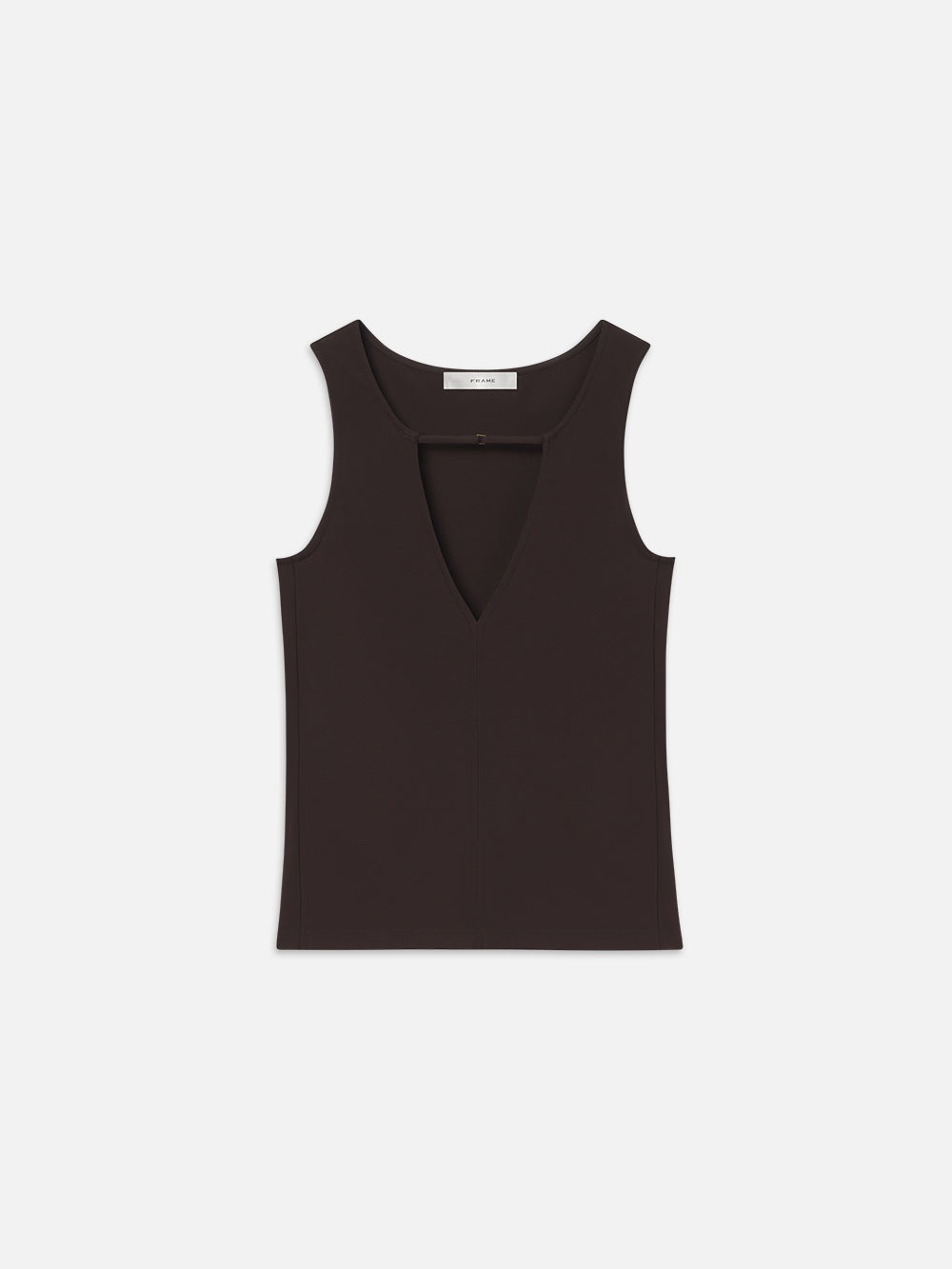 This super soft knit tank features a deep-v neckline, and elevated seam detailing down the front for an elevated take on the wardrobe basic. The unique strap detail at the neckline, joined by a gold clasp, adds a subtle edge to your look. Materials & Care Hand Wash Cold 100% Viscose 21.375" Long From Shoulder WF24JKT001-CHBR