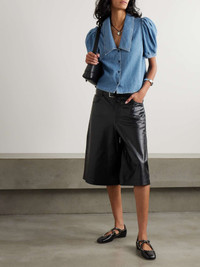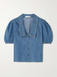 EDITORS'NOTES The sailor collar and puffed sleeves on FRAME's blouse create such a chic, vintage feel. It's made from denim - 20% of the cotton is recycled from post-consumer sources - and fastens with glossy buttons. Tuck yours into a pair of high-rise jeans. SIZE & FIT Model measurements: - Fits true to size, take your normal size - Designed for a slightly loose fit - Mid-weight, non-stretchy denim - Model is 175cm/ 5'9" and is wearing a size Small - Bust: 81cm/ 32" - Waist: 61cm/ 24" - Hip: 89cm/ 35" DETAILS & CARE - Blue denim - Button fastenings through front - 80% cotton, 20% recycled cotton