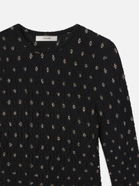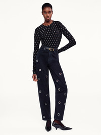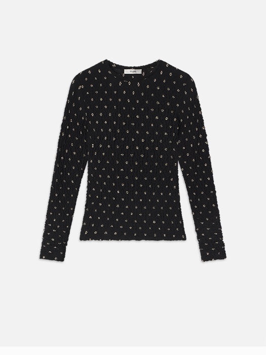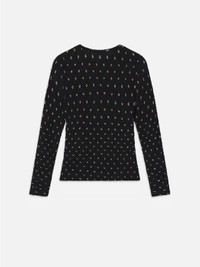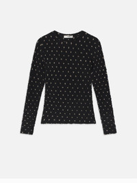 Be spotted in the Dotted Stretch Mesh Top. This luxe top has a close-fitting cut and stretches into a semi-sheer, textured fabric. Embellished by gold lurex dots, this elevated basic can be effortlessly dressed up with a silk trouser or skirt, or styled with denim for everyday wear. Materials & Care Dry Clean Only 93% Nylon/4% Elastane/2% Metallic/1% Polyester 22" Long From Shoulder WP25JKT009-BKMU