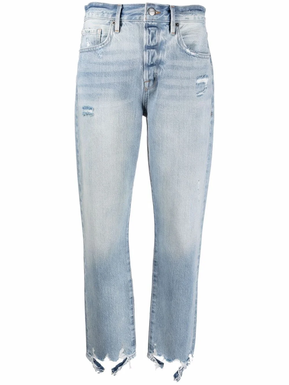 faded slim-cut jeans blue cotton raw-cut hem faded effect belt loops front button and zip fastening classic five pockets Imported Composition Cotton 85%, Recycled Cotton 15% SIZE & FIT Model measurements Height 5 ft 10 in(1.78 m) Bust/Chest 33.46 in(85 cm) Hips 36.22 in(92 cm) Waist 23.22 in(59 cm) FittingInformation This piece fits true to size. We recommend you get your regular size Designed to be fitted at the waist and hips, loose over the leg Made with a mid-weight non-stretch fabric