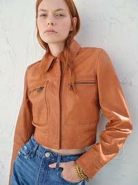 Approach the leather jacket in a new way with this moto style in light brown rigid leather. Slightly cropped and fitted, it has a hidden snap closure at the front placket and exposed zippers at the chest patch pockets and sleeves. Wear yours with high-waist jeans or the matching Pleated Leather Short for a complete look. Materials & Care Clean Professionally By A Leather And Suede Specialist 100% Leather 19.5" Long From Shoulder WS24LJA005-LTWY
