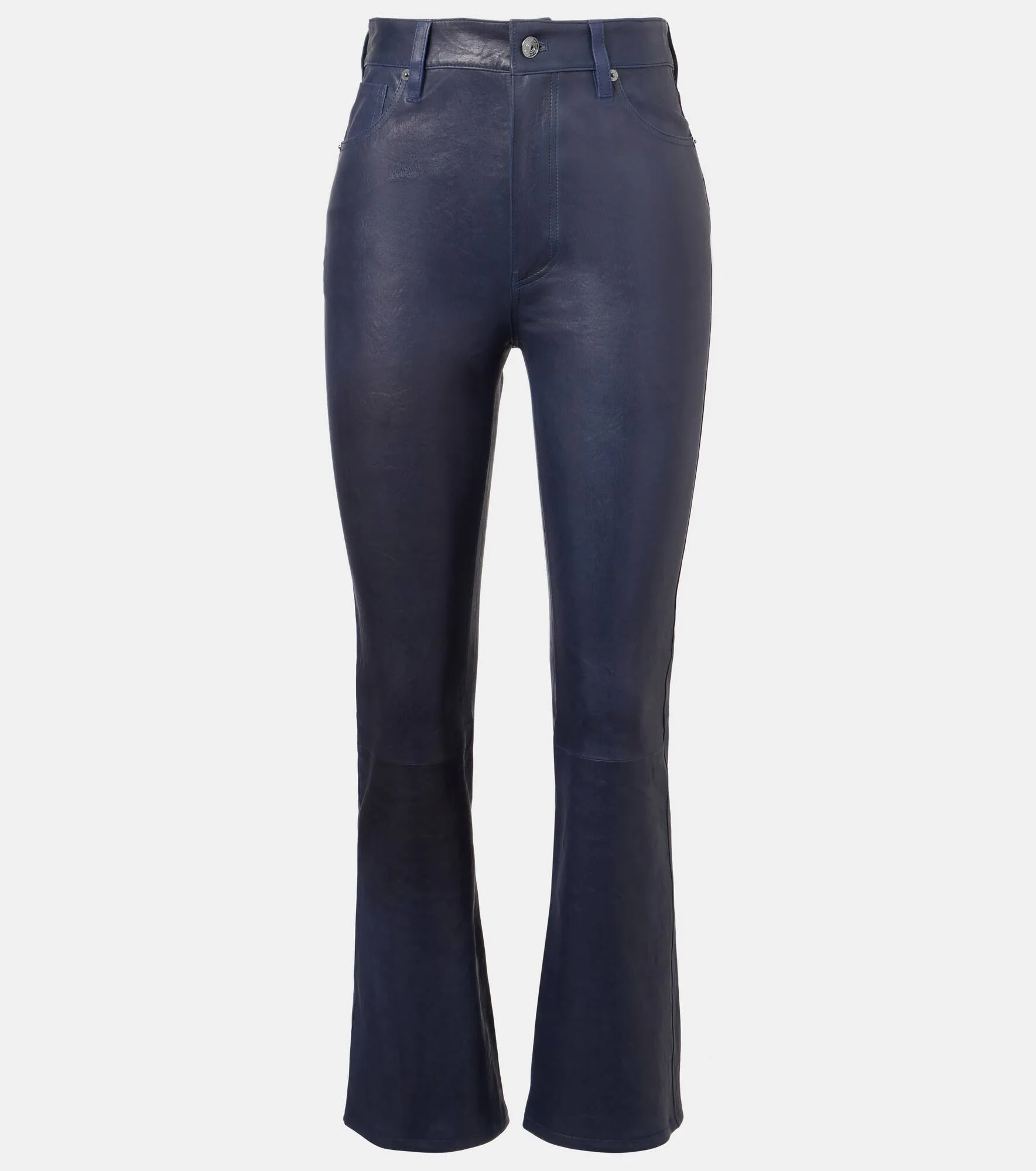 The Reboot Crop pants from Frame showcase the brand's dedication to meticulous craft and everyday sophistication. This iteration of the beloved design is made from ultra-soft leather and comes in a bootcut silhouette that hits above the ankle. Product Details - Material: 100% lamb leather - Care instructions: specialist clean - Made in Turkey - Designer color name: Dark Indigo - Item color: blue - Pockets: five pockets - Closure: zipper fly, button fastening - Belt loops - Hardware color: silver - Item number: P01055574 Size & Fit - True to size - Slightly stretchy fabric - Bootcut - The model seen in the picture is 178cm-5'10" and wearing a size 26