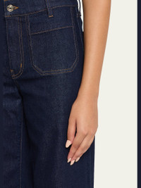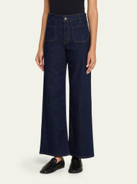 FRAME "Le Slim Palazzo Modernist Pocket" jeans in dark-wash stretch-denim Approx. 11" rise; 31" inseam High rise Front and back patch pockets Wide legs with a subtle flare Full length Button/zip fly; belt loops Cotton/polyester/lyocell Machine wash cold Imported Online Inquiries: BGS21_T6W3N| Store Inquiries: #4974331