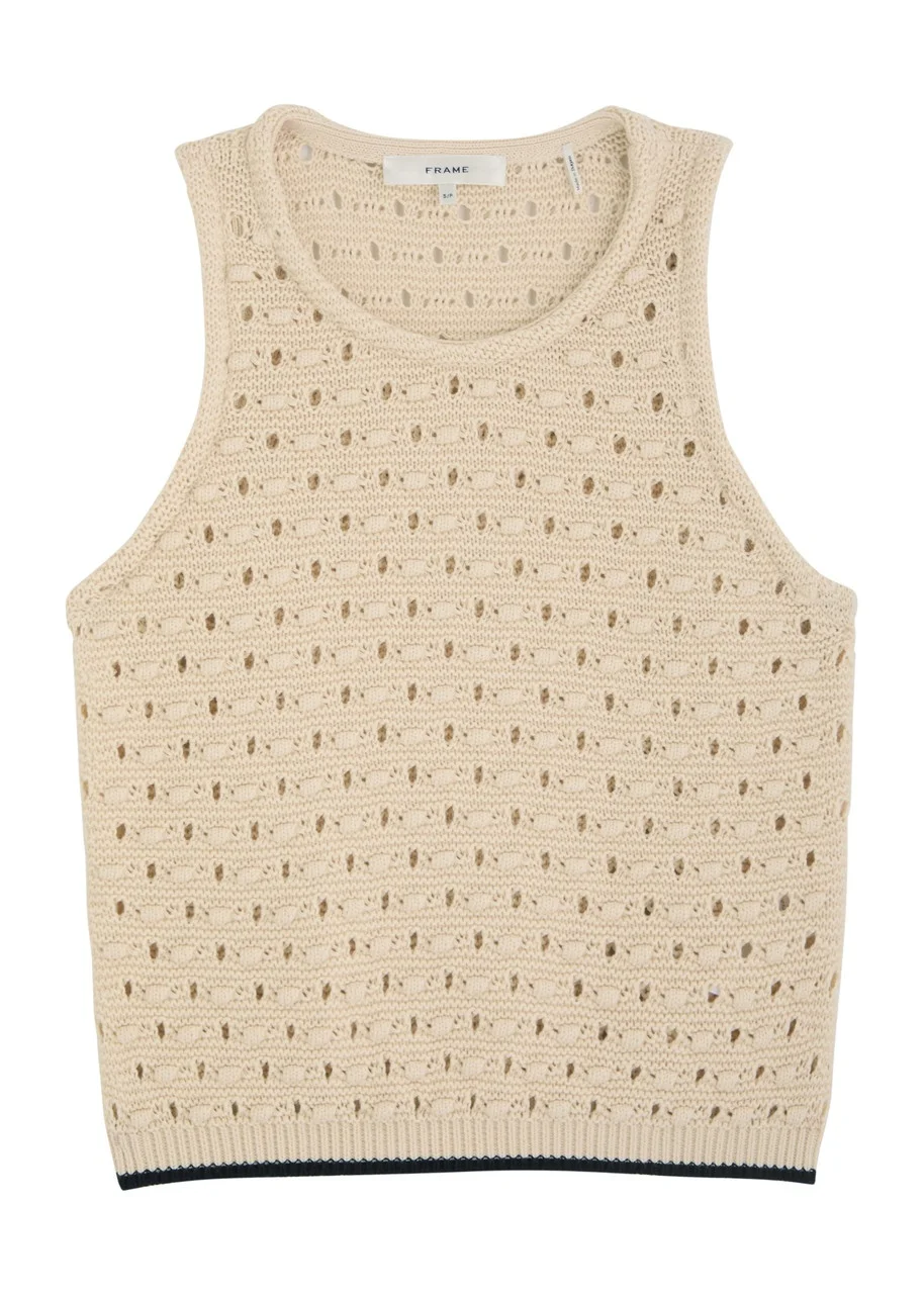 Info & Care Frame open-knit tank Knit bobble details, reinforced edges, contrasting stripe at ribbed hem Slips on; 100% cotton Dry clean Size & Fit Length shoulder to hem: 19.5 inches/ 49.5cm Midweight Slim fit, slightly cropped Model is 5'10"/ 178cm and wears a size small;