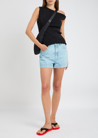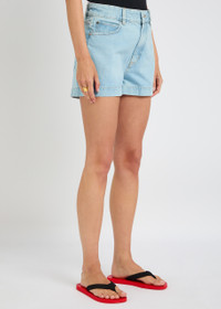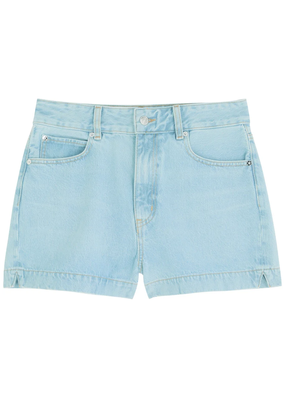 Info & Care Frame denim shorts Belt loops, five pockets, designer-engraved press-stud embellishments, side splits at hem Partially concealed button and zip fastenings at front 100% cotton Machine wash inside out to avoid colour transfer Size & Fit Length waist to hem: 13 inches/ 33cm Midweight Regular fit Model is 5'9"/ 175cm and wears a size W27