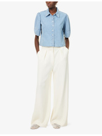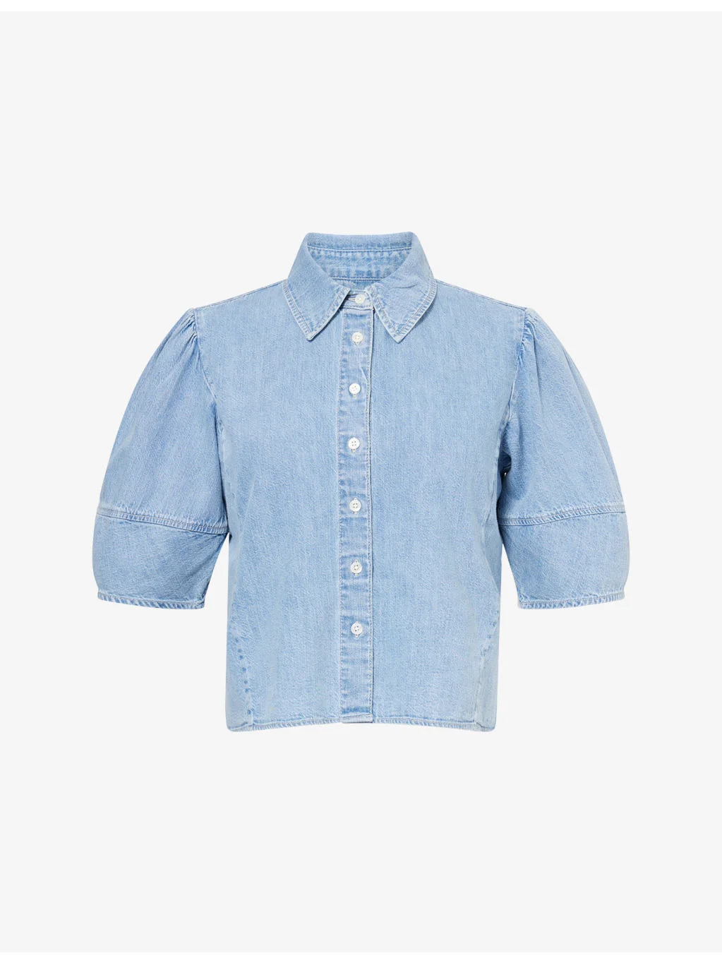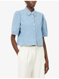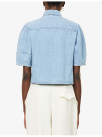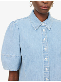 PRODUCT DETAILS - FRAME denim top - 100% cotton - Button fastening - Regular fit, collar, short sleeves, panelled construction, mid-faded wash, contrast stitching, pearlescent buttons - Machine wash cold - True to size - Size small: length 19in / 48cm - Model is 5ft 10in/1.78m and wears a size small - Midweight, non-stretch Ref: R04509263