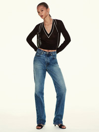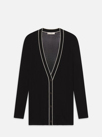 Prep, perfected. Knit from a breathable cotton-viscose blend, this open-stitch cardigan features bold contrast striping and varsity-inspired rib trim. The fit is close to the body without being tight—ideal layered over the matching vest and denim. Materials & Care Dry Clean Only 53% Viscose/47% Cotton 30" Long From Shoulder WE25KSW023-BKMU