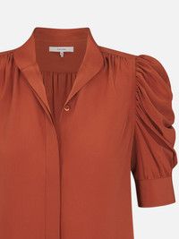 At once modern and romantic, this silk blouse has become a FRAME favorite. Featuring a high neckline and boldly puffed sleeves with ruched detailing, it easily complements any of your denim. Finish the look with leather boots and a slim belt. Materials & Care Dry Clean Only 100% Silk 25.0" Long From Shoulder LWSH2437-DRST