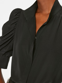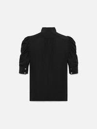 This delicate silk blouse epitomizes modern femininity, featuring a high neckline and boldly puffed sleeves with ruched detailing. We love it tucked into cropped wide jeans with leather slides and a slim belt. Materials & Care 100% Silk Dry Clean Only 25" Long From Shoulder LWSH2437-NOIR Fit Model is 5'10" Tall/177cm and is Wearing a US Size S