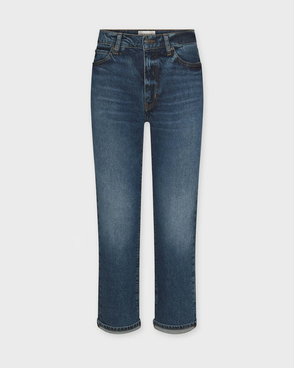 The Borrowed Nebula Jeans from FRAME. Modern boyfriend jeans with a mid-rise and straight fit, flattering over the hips and ending at the ankle with a 1-inch turned-up hem. Stretch fabric provides extra comfort and a relaxed yet polished feel. Perfect for both everyday wear and work. Size and Fit - Fits true to size, choose your usual size - The model is 176 cm tall and is wearing size 27 Specification - Article number - ID: 177073-508 - Brand: Frame - Color: Washed blue - Washing Instructions: Maskintvatt - Made of: 99% bomull, 1% elastan