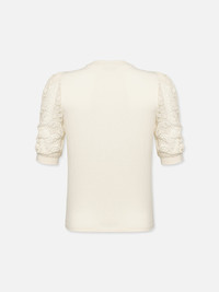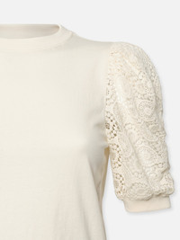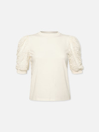 Our bestselling Frankie Tee is done in soft Cream cotton, with a slim fit and elbow-grazing puff sleeves crafted from ultra-feminine lace. Pull yours on with jeans for coffee runs, style it with trousers and pumps for office outfitting, and definitely pack Frankie in your weekender bag. Materials & Care Dry Clean Only Body: 100% Organic Cotton/Sleeve: 100% Cotton 22.5" Long From Shoulder WE24JKT019-CREA
