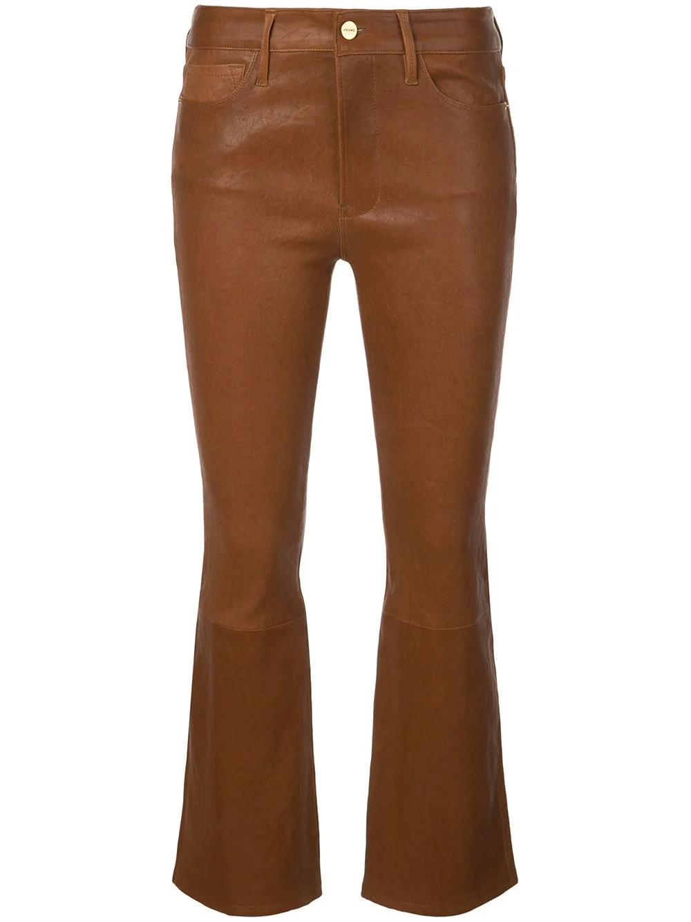 Le Crop leather trousers Tobacco brown Le Crop leather trousers from FRAME featuring a low waist, a waistband with belt loops, a front button fastening, a skinny fit and a cropped length. Imported Composition Lamb Skin 100% SIZE & FIT Model measurements Height 5 ft 10 in(1.77 m) Bust/Chest 33.85 in(86 cm) Hips 35.03 in(89 cm) Waist 24.01 in(61 cm) Measurement FRONT RISE 10.23 in(26 cm) HIPS 32.28 in(82 cm) WAIST 29.92 in(76 cm) Washing instructions Specialist Cleaning