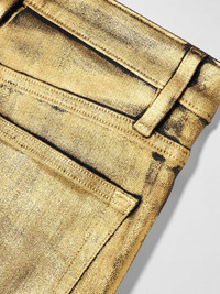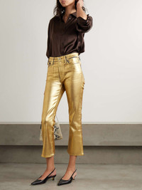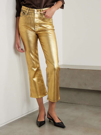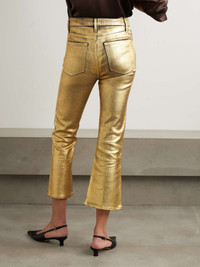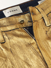 FRAME’s jeans are coated to give them a glistening gold finish that easily transitions from day to night – simply swap sneakers for your favorite heels. Cut from denim for a high-rise fit, they’re made with plenty of stretch so they hug your hips and thighs before flaring out to cropped bootcut hems. Size & Fit - Fits true to size, take your normal size - High-rise, cut for a slim fit with a bootcut hem - Cropped length - Mid-weight, slightly stretchy fabric - Size 27 jeans have an inside leg of 26.5"/ 67cm - Model is 180cm/ 5'11" and is wearing a size 27 Model measurements: - Bust: 80cm/ 31.5" - Waist: 67cm/ 26" - Hip: 89cm/ 35" Details & Care - Gold coated-denim - Button and concealed zip fastening at front - 98% cotton, 2% elastane - Dry clean - Designer wash: Gold Chrome