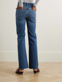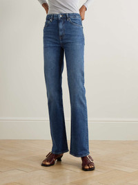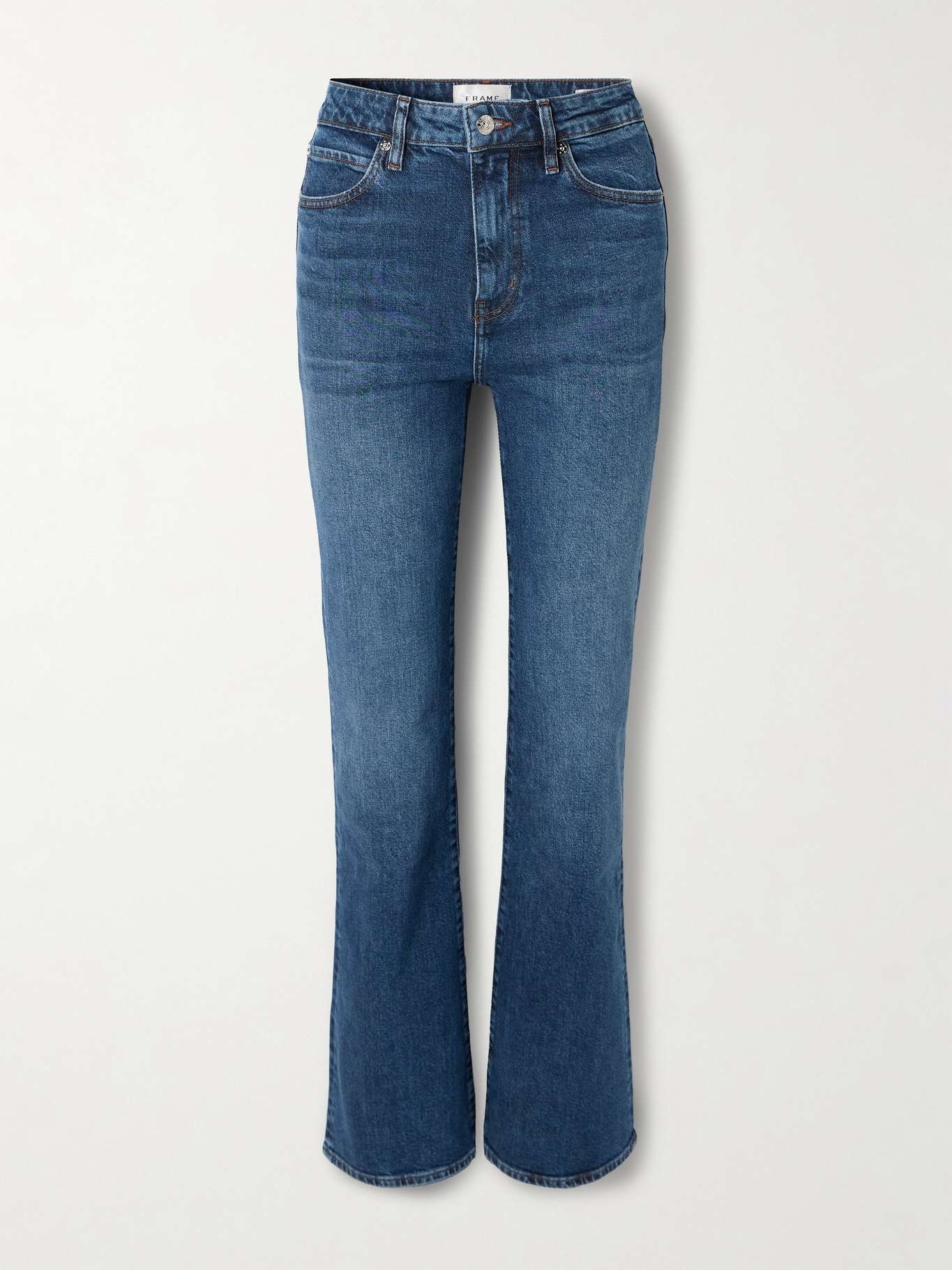 EDITORS'NOTES FRAME describes its 'The Arrow' jeans as "a vintage favorite with modern sensibility." They're cut from denim woven with just a hint of stretch for comfort and have a retro high-rise, lightly flared fit. SIZE & FIT Model measurements: - Fits true to size, take your normal size - High-rise, intended for a slim fit with a flared hem - Mid-weight, slightly stretchy fabric - Size 26 jeans have an inside leg of 32"/ 82cm - Model is 180cm/ 5'11" and is wearing a size 26 - Bust: 80cm/ 31.5" - Waist: 65cm/ 25.5" - Hip: 89cm/ 35" DETAILS & CARE - Dark-blue denim - Button and concealed zip fastening at front - 99% cotton, 1% elastane - Machine wash - Designer wash: Rival