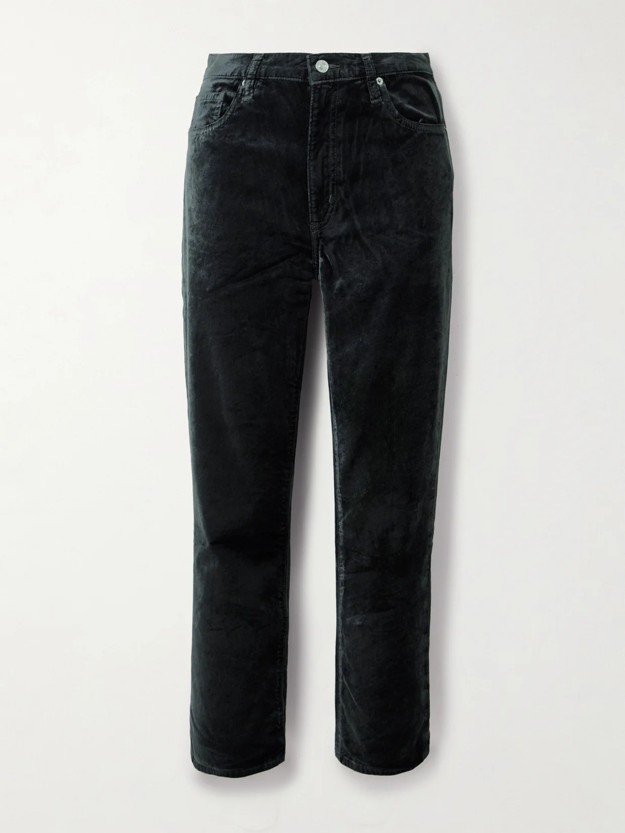 FRAME's 'Le Sleek' jeans are cut from lustrous velvet in a rich jewel tone the label calls 'Green Smoke'. Designed to sit high on the waist, they fit slim through the hips and thighs before flaring out to cropped, bootcut hems.