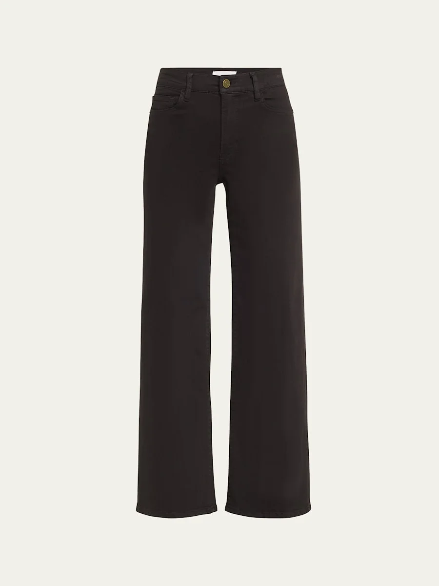 FRAME "Le Slim Palazzo" wide-leg jeans in black denim Approx. 10.5" rise; 31" inseam High rise Five-pocket style Slim fit Full length Button/zip fly; belt loops Cotton/polyester/elastane Machine wash cold Imported Model is 5'10"/177cm. Online Inquiries: BGS21_T5Q7S| Store Inquiries: #4789670