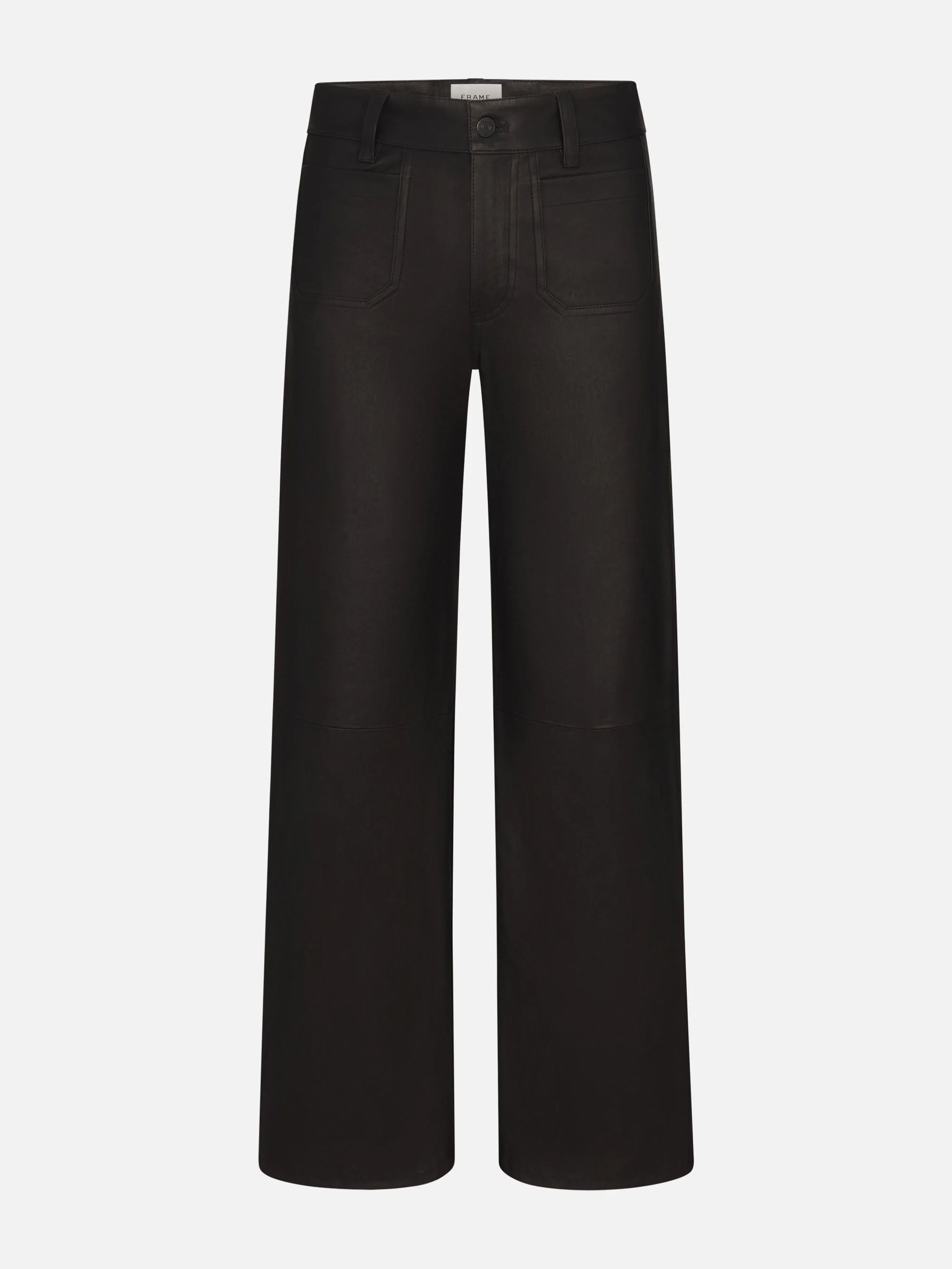 Our bestselling high rise silhouette, reimagined in 100% lamb leather. Designed with a fitted hip, flared leg and chic front pocket details. Materials & Care High Rise Fit Clean Professionally By A Leather And Suede Specialist 100% Lamb Leather 11" Front Rise/31" Inseam/22.5" Leg Opening WF25LPA008-BLK
