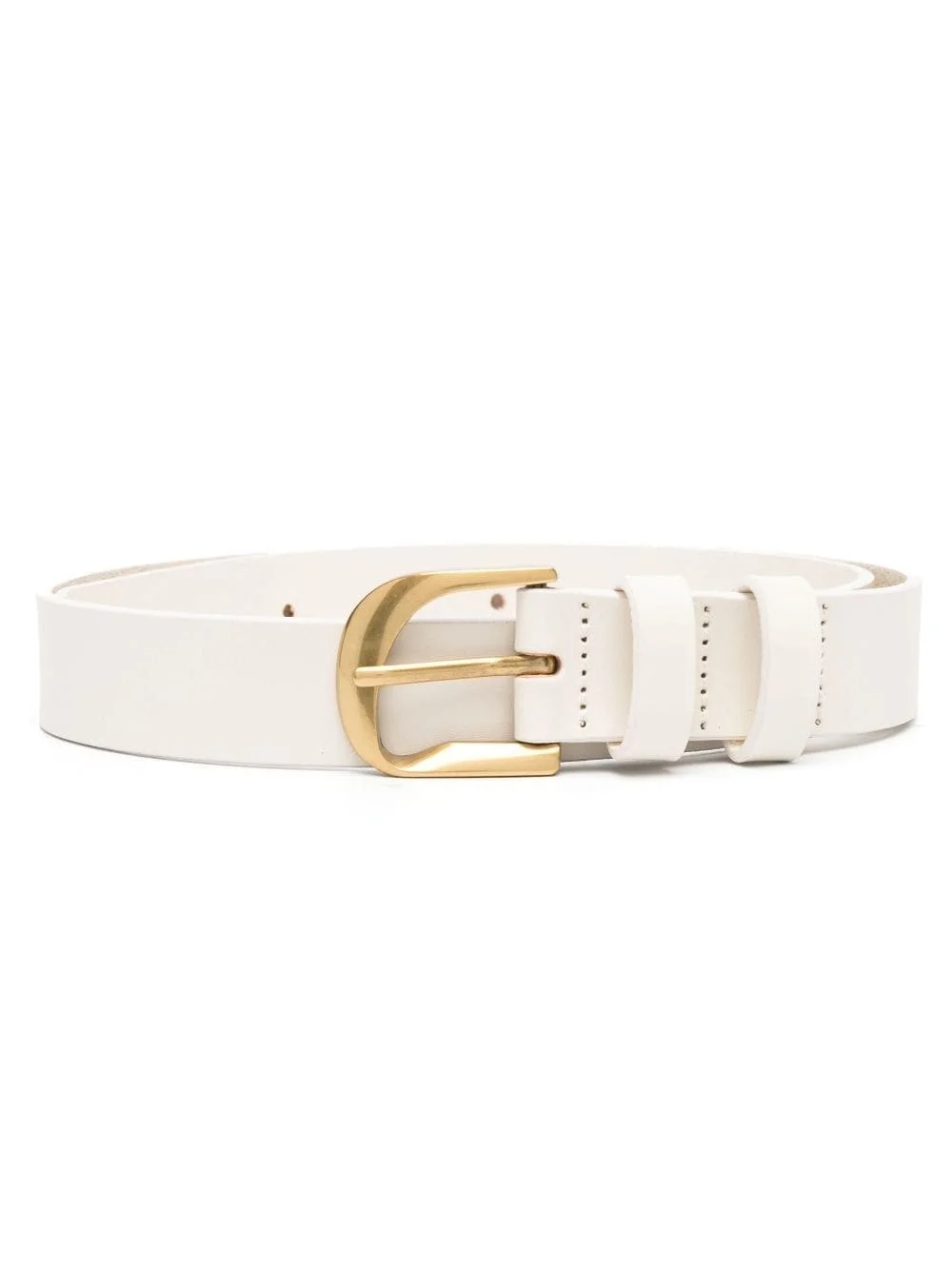 logo-engraved buckle leather belt Highlights - Off-white/gold - Calf leather - Smooth grain - Logo-engraved buckle - Punched holes - Adjustable fit - Straight tips Imported Composition Calf Leather 100% SIZE & FIT Measurement Maximum Length 33.46 in(85 cm) Minimum Length 27.55 in(70 cm)