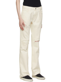Flared non-stretch denim jeans in off-white. Distressing throughout. · Low-rise · Five-pocket styling · Belt loops at waistband · Raw edge at cuffs · Zip-fly · Logo-engraved silver-tone hardware Supplier color: Parchment rips