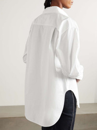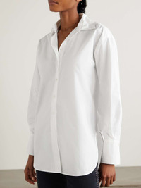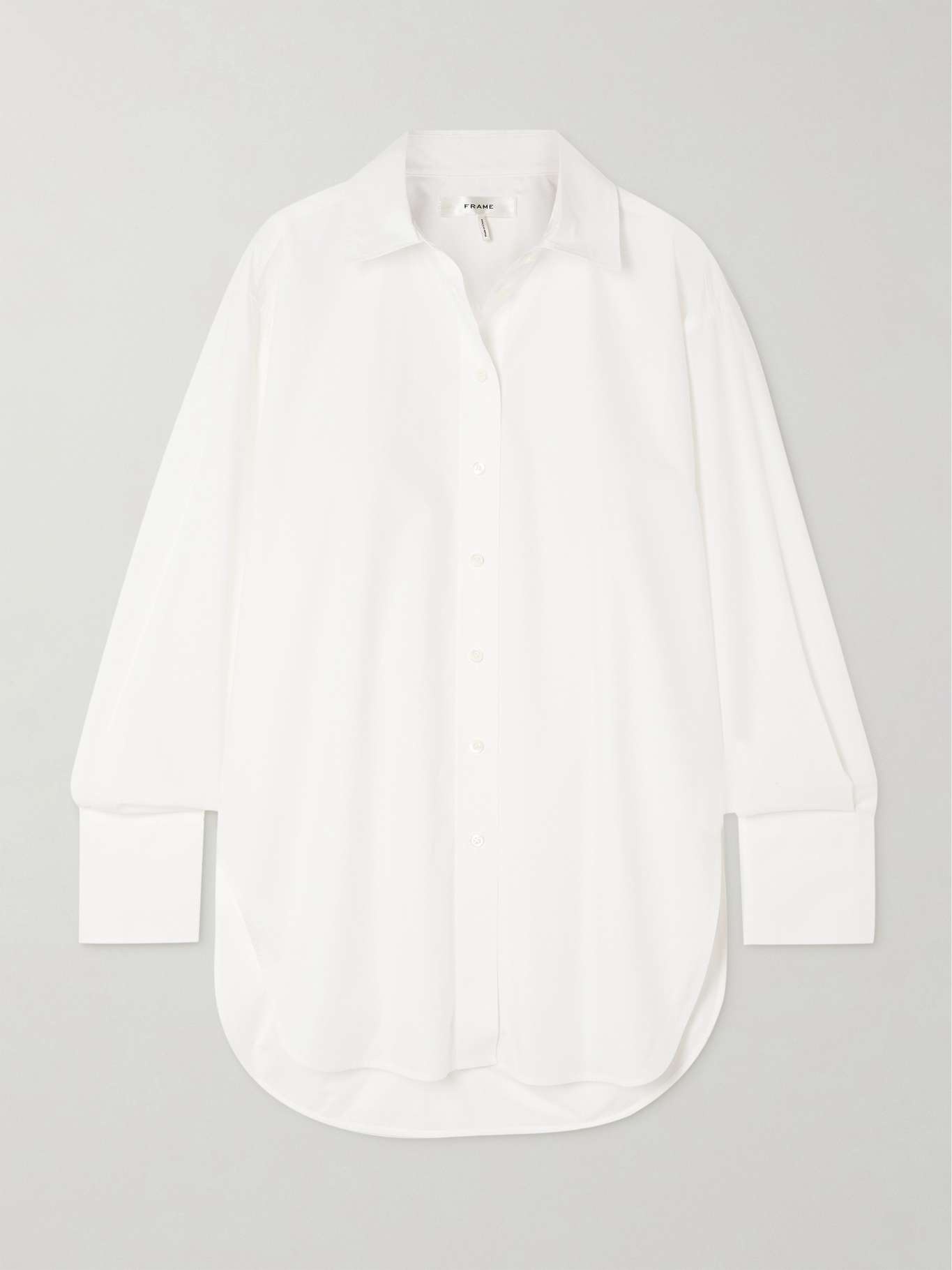 EDITORS'NOTES FRAME doesn't just make jeans, but the perfect pieces to wear with them. This shirt is tailored from organic cotton-poplin for a loose fit - it gives a borrowed-from-the-boys vibe and fits effortlessly, whether tucked or loose. SIZE & FIT Model measurements: - Fits true to size, take your normal size - Designed for a loose fit - Mid-weight, non-stretchy fabric - Model is 180cm/ 5'11" and is wearing a size XSmall - Bust: 80cm/ 31.5" - Waist: 65cm/ 25.5" - Hip: 89cm/ 35" DETAILS & CARE - White organic cotton-poplin - Button fastenings through front - 100% organic cotton - Machine wash