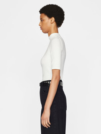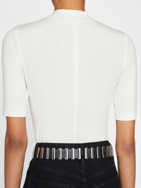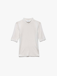 With a slim fit and modern mock neck, this short sleeve microribbed top is a seasonless closet staple. Style under blazers and cardigans, solo tucked into flares and leather trousers. Materials & Care 96% Modal/4% Spandex Dry Clean Only 21.75" Long From Shoulder LWTS1839-OFFW Fit Model is 5'11" Tall/180cm is wearing a US Size S