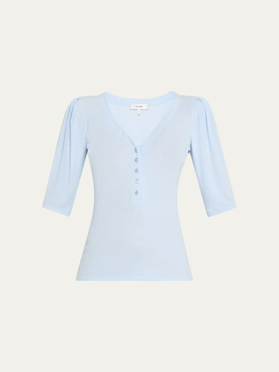 FRAME rib-knit henley top featuring ruched sleeves V neckline; button placket Short sleeves Slim fit Hem sits at the hip Pullover style Modal/spandex Hand wash or dry clean Imported Online Inquiries: BGS21_T658Z| Store Inquiries: #4905022