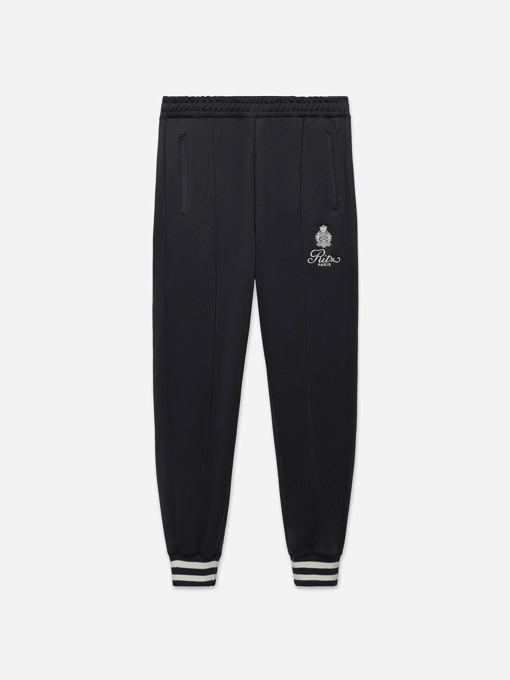 Paired with the matching jacket, these track suit pants are leisure essentials with luxury credentials. The Ritz Paris and FRAME logos are embroidered in white to contrast the classic Navy colorway, and this pant features a tapered leg fit finished with smart striped cuffs. Each piece from the FRAME x Ritz Paris collaboration is crafted from luxe materials and designed to evoke the opulence and comfort of staying inside the world's most luxurious hotels. Materials & Care 55% Polyester/45% Cotton Machine Wash 10.5" Front Rise/27" Inseam/5.625" Leg Opening LWKB0337-NAVY