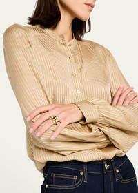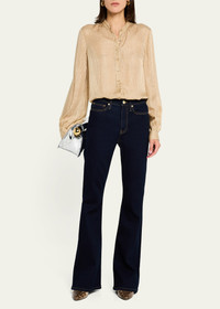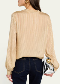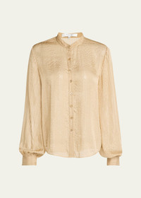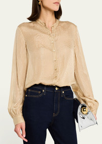 FRAME silk-blend blouse featuring metallic stripes High neckline Long sleeves with button cuffs Classic fit Hem falls to the hip Button-front Silk/cotton/nylon/polyamide Dry clean Imported Online Inquiries: BGS21_T64GR| Store Inquiries: #4901201
