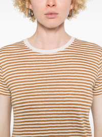 striped T-shirt Highlights - Ochre brown - Crew neck - Short sleeves Imported Composition Organic Linen 100% SIZE & FIT Model measurements Height 5 ft 9 in(1.75 m) Bust/Chest 34.64 in(88 cm) Hips 36.61 in(93 cm) Waist 26.37 in(67 cm) FittingInformation Designed for a slim fit that sits just away from the body offering a close yet comfortable fit Made from a lightweight non-stretch fabric, this piece offers minimal elasticity when worn