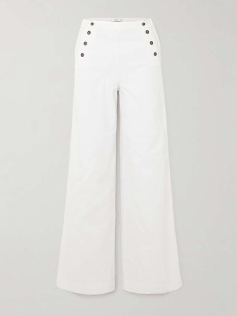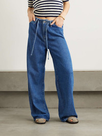 EDITORS'NOTES FRAME's jeans are threaded with a drawstring through the high-rise waistband, making them almost as comfy as your favorite track styles. They're blended with 20% recycled cotton and have wide-legs. SIZE & FIT Model measurements: - Fits true to size, take your normal size - The model is wearing a size larger to achieve a relaxed fit - High-rise, cut for a wide-leg fit - Mid-weight, non-stretchy fabric - Size 27 jeans have an inside leg of 31.5"/ 80cm - Model is 177cm/ 5'10" and is wearing a size 27 - Bust: 81cm/ 32" - Waist: 68cm/ 27" - Hip: 94cm/ 37" DETAILS & CARE - Blue denim - Button and concealed zip fastening at front - 80% cotton, 20% recycled cotton - Machine wash - Designer wash: Ghost