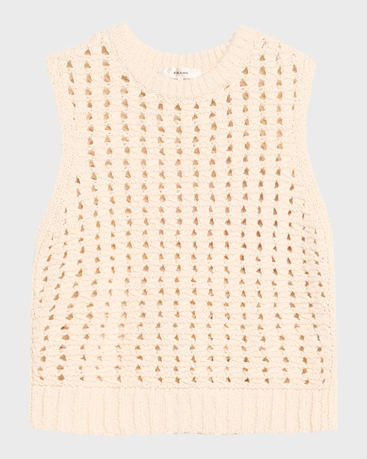 FRAME sweater vest in tape yarn High crew neckline Sleeveless Easy fit Hem sits at the hip Pullover style Cotton Dry clean, machine wash cold Imported