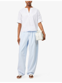 PRODUCT DETAILS - FRAME cotton-blend trousers - 70% cotton, 30% lyocell - Button and zip-fly fastening - Relaxed fit, high-rise, tapered-leg, structured waistband with belt loops, pleat detail at front, two angled slip pockets, two welt pockets at back, all-over faded wash - Machine wash at 30°C - Made in Turkey - True to size - Size 26: rise 12.5in / 31cm, inside leg 32in / 82cm, leg opening 18in / 46cm - Model is 5ft 11in/1.80m and wears a size 26 - Midweight, non-stretch Ref: R04461260