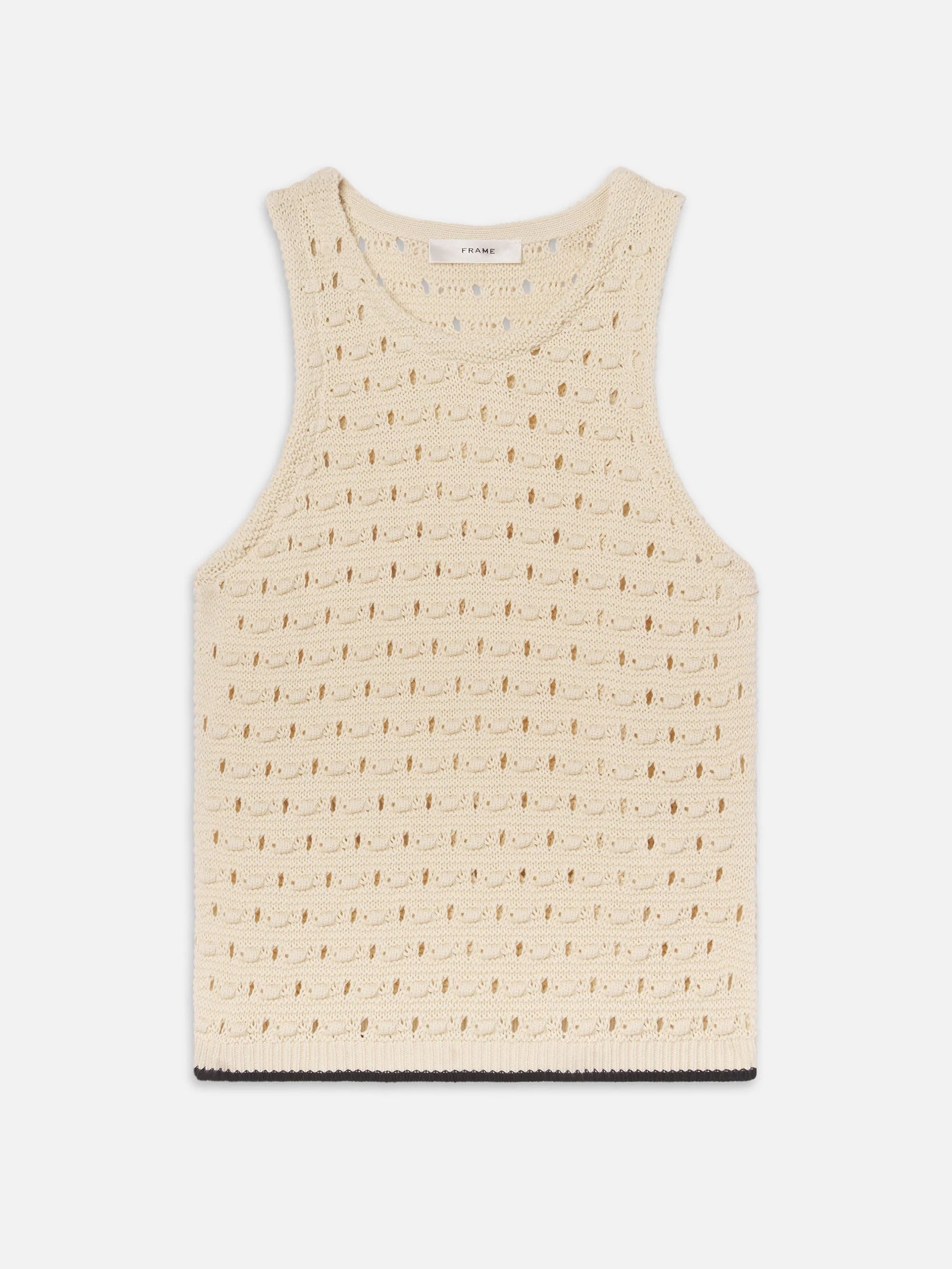 Our signature Bauble texture—lightweight, airy, and dimensional—features pointelle openwork made for warm days. Designed with a scoop neckline and contrast hem, this tank forms a matching set with The Bauble Skirt, or pairs with denim for quiet charm and vintage ease. Materials & Care Dry Clean Only 100% Cotton 18.5" Long From Shoulder WE25KSW028-CREA