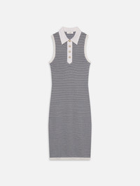 Crafted in cotton, cashmere, and linen, The Bold Stripe Dress is a triple threat. The sleeveless design features contrast fabric at the collar and button placket, as well as a navy stripe motif—perfect for the coastal prep moment that's taking over summer. Materials & Care Dry Clean Only 59% Cotton/41% Cashmere, Trim: 100% Linen 48" Long From Shoulder WE25KDR006-NAMU