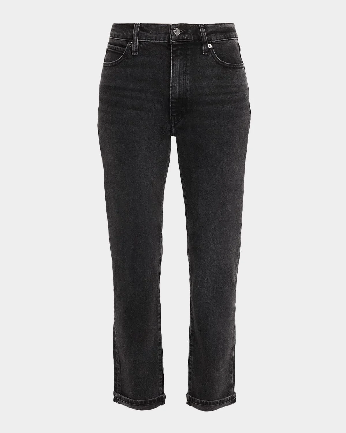 - FRAME "The Borrowed" jeans finished with a cuffed hem in black stretch-denim - Approx. 10.3" rise; 27.5" inseam - Mid-rise; sits high on the hip - Five-pocket style - Straight legs - Ankle length - Button/zip fly; belt loops - Cotton/elastane - Machine wash inside out - Imported