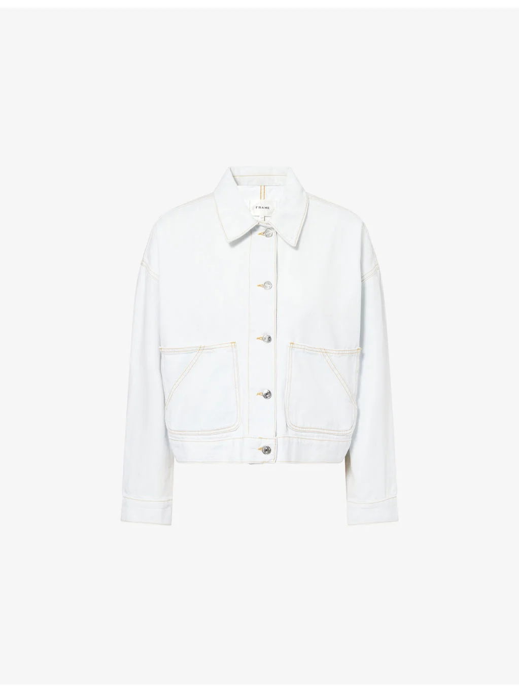 PRODUCT DETAILS - FRAME denim jacket - 100% cotton - Exposed button fastenings at front - Boxy fit, pointed collar, dropped shoulders, long sleeves, buttoned cuffs, two front patch pockets with slip at front, silver-toned branded buttons, contrast stitching - Machine wash at 30°C - Made in Tunisia - True to size - Size small: length 22in / 56cm - Model is 5ft 10in/1.78m and wears a size small - Midweight, non-stretch Ref: R04461262