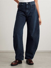 FRAME's best-selling ‘The Bubble’ jeans are "an exaggerated take on the trending barrel silhouette". They're cut from denim with a 'Dorado' wash and sit high on the waist. Unroll the cuffs to lengthen the inseam. Lower-Impact Materials. This product is made using at least 50% lower-impact materials or ingredients. Find out more about our NET SUSTAIN criteria here. Size & Fit - Fits true to size, take your normal size - High-rise, cut for a wide-leg fit - Mid-weight, non-stretchy denim - Size 26 jeans have an inside leg of 27"/ 70cm Details & Care - Dark-blue denim - Button and concealed zip fastening at front - 100% cotton - Machine wash - Designer wash: Dorado - This product has been made with regenerative cotton, supporting holistic farming practices that increase soil health, improve biodiversity and reduce carbon emissions