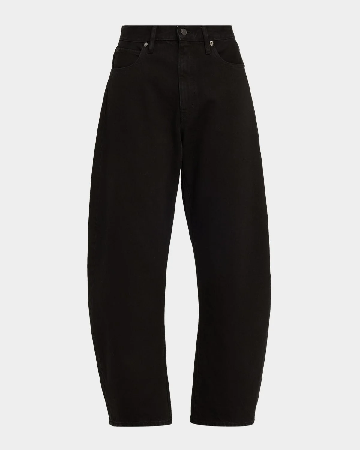 FRAME "The Bubble" jeans in black denim Approx. 10.8" rise; 31" inseam High rise Fivepocket style Relaxed, barrel legs Full length Button/zip fly; belt loops Cotton Machine wash cold Made in USA