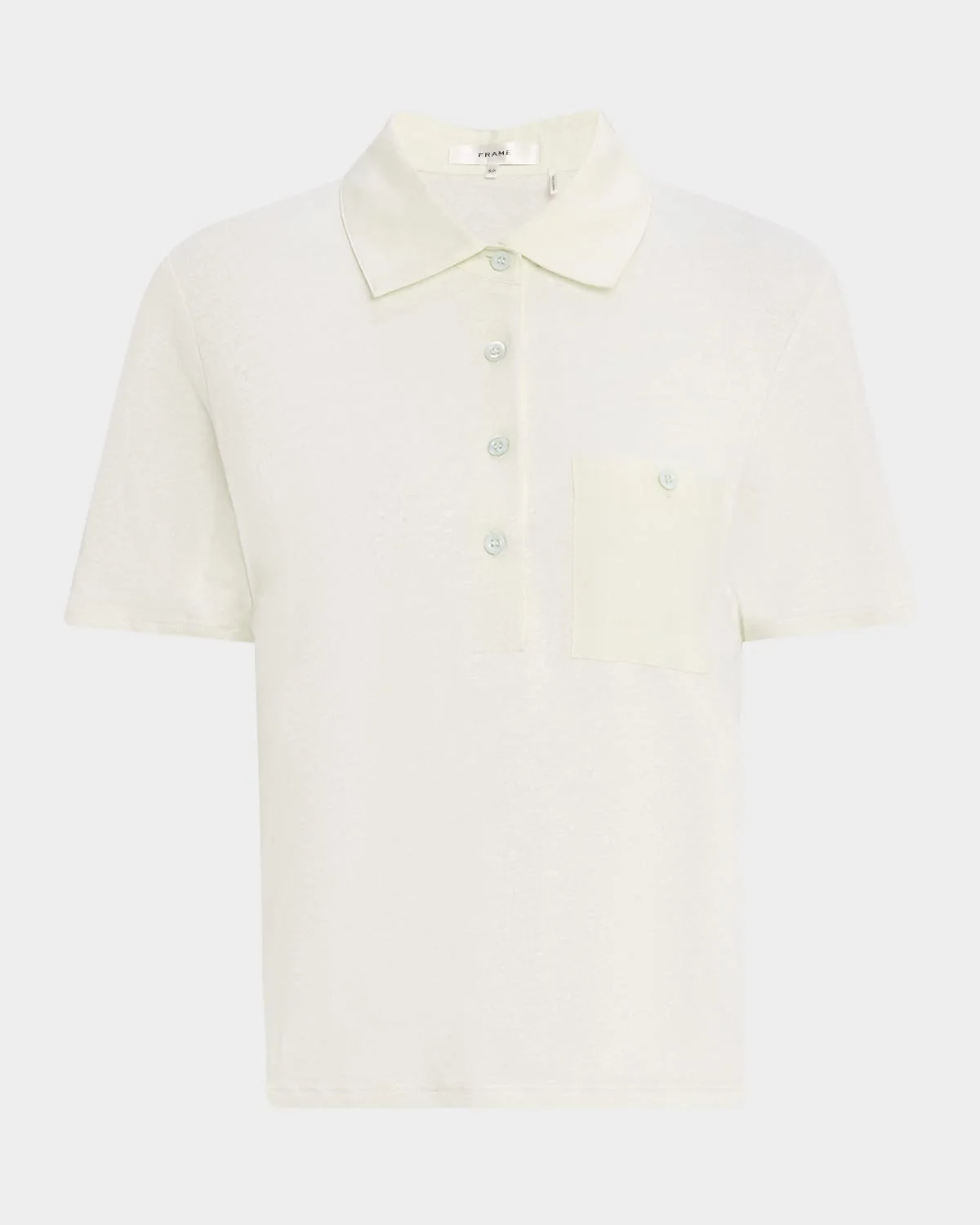 - FRAME soft linen-blend polo shirt - Point collar; button-placket - Short sleeves - Chest pocket - Classic fit - Hem falls to the hip - Pullover style - Linen/spandex/ramie - Hand wash or dry clean - Imported