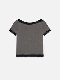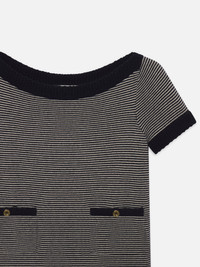 Pure cashmere sets the tone for this boatneck tee. Classic black-and-white stripes pair with an elegant swooped neckline, while black trim outlines the hems and two front pockets, accented with gold-toned details. Materials & Care Dry Clean Only 100% Cashmere 19.5" Long From Shoulder WS25KSW009-NAMU