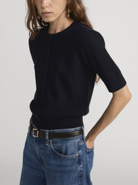 The Short Sleeve Chain Pointelle Cardigan is crafted from 100% cashmere with airy ladder-pointelle stitching, featuring slight puff sleeves and soft shoulder shirring for a light, feminine silhouette. DETAILS - Dry Clean Only - 100% Cashmere - 20" Long From Shoulder - WP26KSW060-NAVY