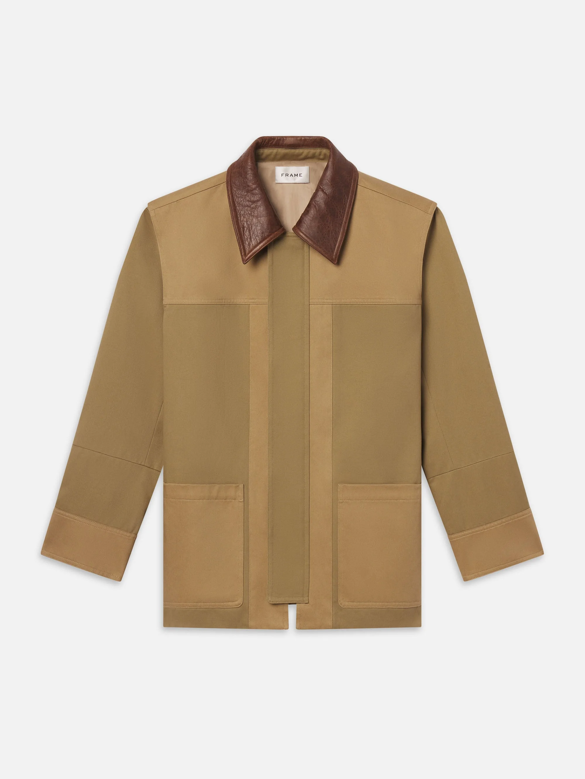FRAME’s modern take on the classic barn jacket. Crafted in structured cotton with tonal leather trim at the collar and elbow patches. Finished with a covered placket and a longer, hip-grazing length for effortless layering. Materials & Care Dry Clean Only Self/Combo: 100% Cotton 29.5" Long From Shoulder WF25WJA009-KHAK