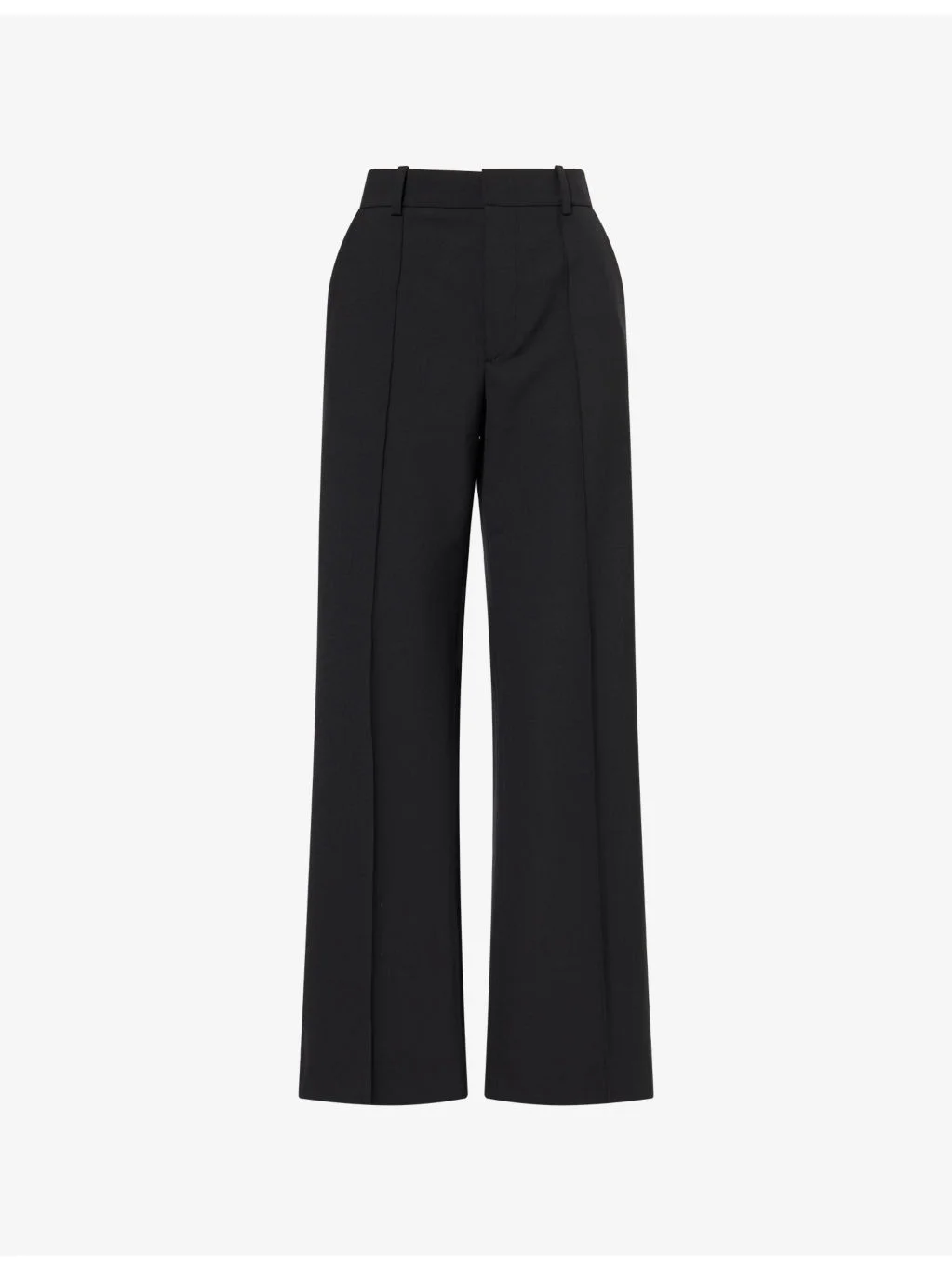 PRODUCT DETAILS - FRAME stretch-woven trousers - 53% polyester, 43% virgin wool, 4% elastane - Concealed button, hook-and-eye and zip-fly fastening at front - Relaxed fit, high-rise, straight leg, belt loops, two slip pockets at front, two buttoned pockets at back, stitched creases at front and back - Dry clean only - Made in Turkey - True to size - Size UK 8: rise 13in / 33cm, inside leg 31in / 80cm, leg opening 20in / 51cm - Model is 5ft 10in/1.78m and wears a size UK 8 - Lightweight, slight stretch Ref: R04538765