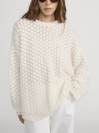 The Cloud Crew is crafted from a soft mohair-wool blend in an airy, open knit with a subtle pom-pom texture, creating a light, dimensional silhouette ideal for layering. DETAILS - Dry Clean Only - 30% Mohair/30% Wool/40% Nylon - 25.75" Long From Shoulder - WP26KSW002-CREA