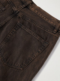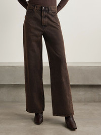 FRAME's 'The Collegiate' jeans have a wide-leg shape that gives them a cool, '70s feel. Designed to sit high on the waist, they're made from rigid denim in a dark-brown wash called 'Nightmoth'. Size & Fit - Fits true to size, take your normal size - High-rise, cut for a wide-leg fit - Mid-weight, non-stretchy denim - Size 26 jeans have an inside leg of 31.1"/ 79cm - Model is 175cm/ 5'9 and is wearing a size 26 Details & Care - Dark-brown denim - Partially concealed button fastenings along front - 100% cotton - Partially lined - Machine wash - Designer wash: Nightmoth